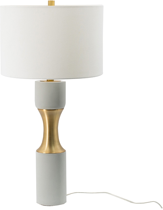 This chic contemporary table lamp is a new modern favorite that’s made using cement with a brass finish metal band. Crafted around a delicate waist in the heart of a cylindrical design, this piece is topped with a white drum shade. This lamp incorporates numerous muted tones to make for a look that’s ideal in a variety of contemporary spaces.