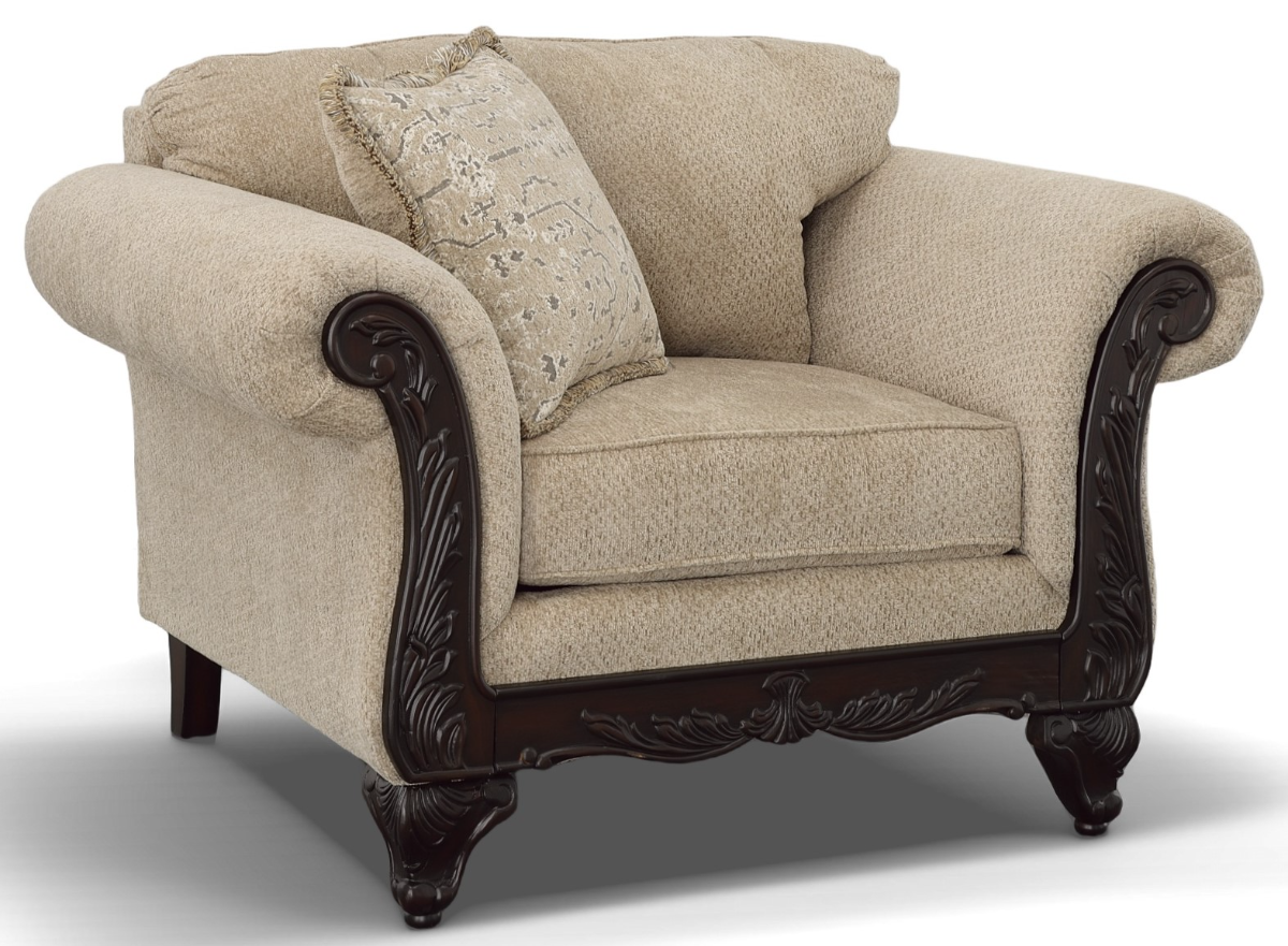 With the Emma chair, add style and comfort to your home. Made in the USA with 100% polyester fabric in a beige color, it is easy to match many types of decoration. Chair seat cushion with rolled arms for comfort and carved dark wood finish.