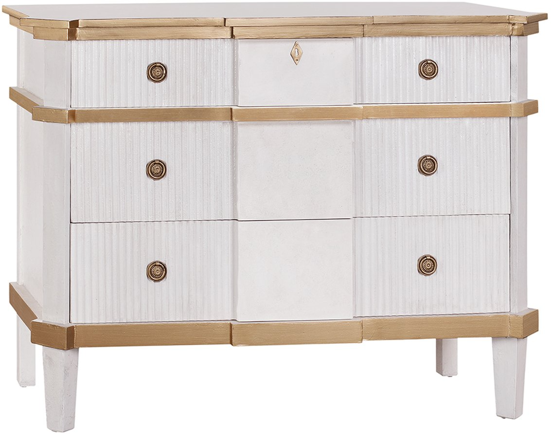 Just as beautiful as useful, this console table is equipped with 3 convenient front drawers adorned with a fluted design. Accented by disk shaped gold hardware.Read More