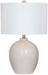 The Ellen Table Lamp boasts a modern aesthetic with its sleek ceramic base in a crisp white hue, accented by subtle cream undertones. Its timeless design is complemented by a white linen drum shade, casting a soft, inviting glow.Read More