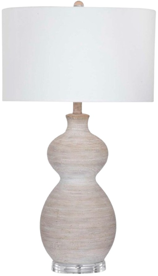The white washed, beige ceramic lamp base and horizontal texturing provides boho styling