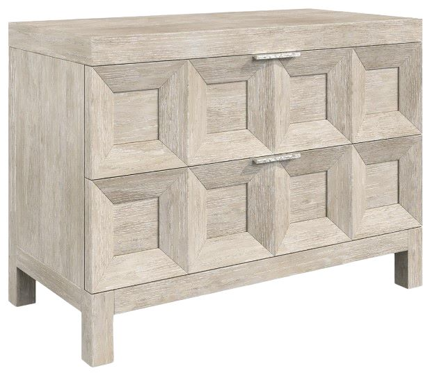 The Prado nightstand finds its inspiration in the coffered ceilings of the Prado museum. Two pull-to-open drawers showcase a dimensional geometric design in cast resin overlays. Subtle grain patterns are highlighted with a Tawny finish. A two-port USB unit offers added functionality on the back of the case.Read More