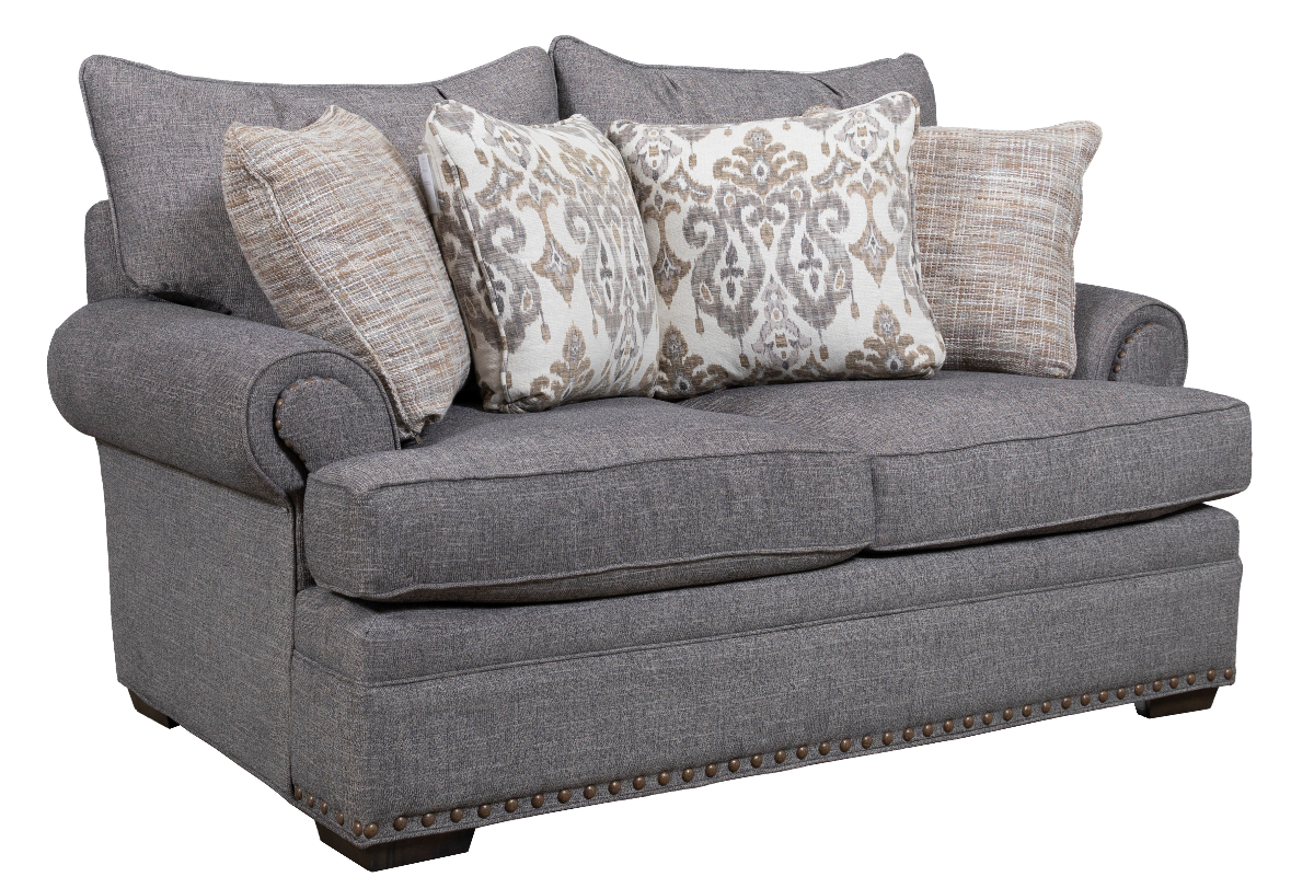 If you love artisan details and plush comfort, this loveseat has a lot to offer. It features 2-seats, 2 loose pillow backs, and 4 accent pillows, along with low block legs. The roll arms are accentuated by an offset front panel and striking nail head trim that is echoed on the base as well. But the comfort is what will win you over. Deep and plush, this loveseat provides the perfect place to snuggle in and relax. Matching sofa, chair & 1/2 and ottoman available.