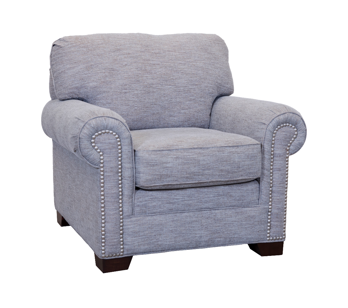 In this updated classic Craftmaster chair, casual sophistication comes to life. Pewter nail heads change the panels of the arm and accentuate the plissed sides. Tapered block legs provide this basic yet elegant look with a modern touch. This accent chair is upholstered for comfort and easy maintenance.
