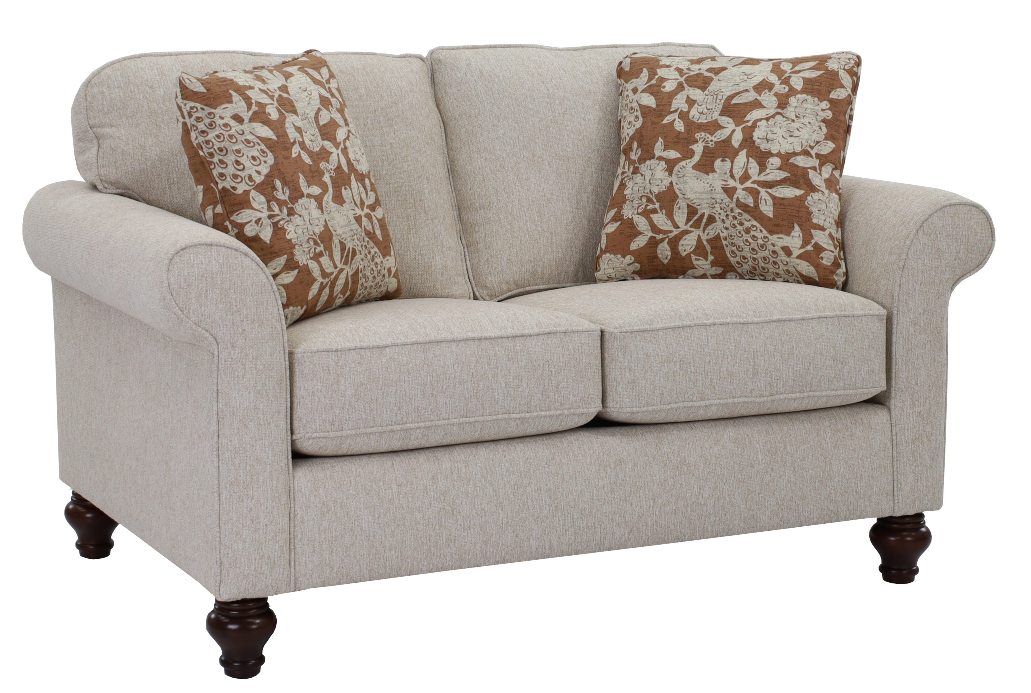 Familiar and comfortable, this classic loveseat style features rolled sock arms, semi-attached back pillows, and simple turned legs.Read More