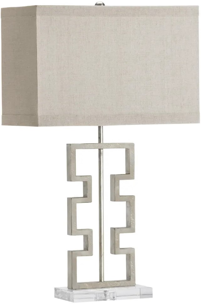 The Crestview Collection Azteca Table Lamp brings a warm glow to your home. The metal body with a gold finish features a geometric, tribal shape. A central pole supports the bulb housed in a natural-colored rectangular shade.Read More