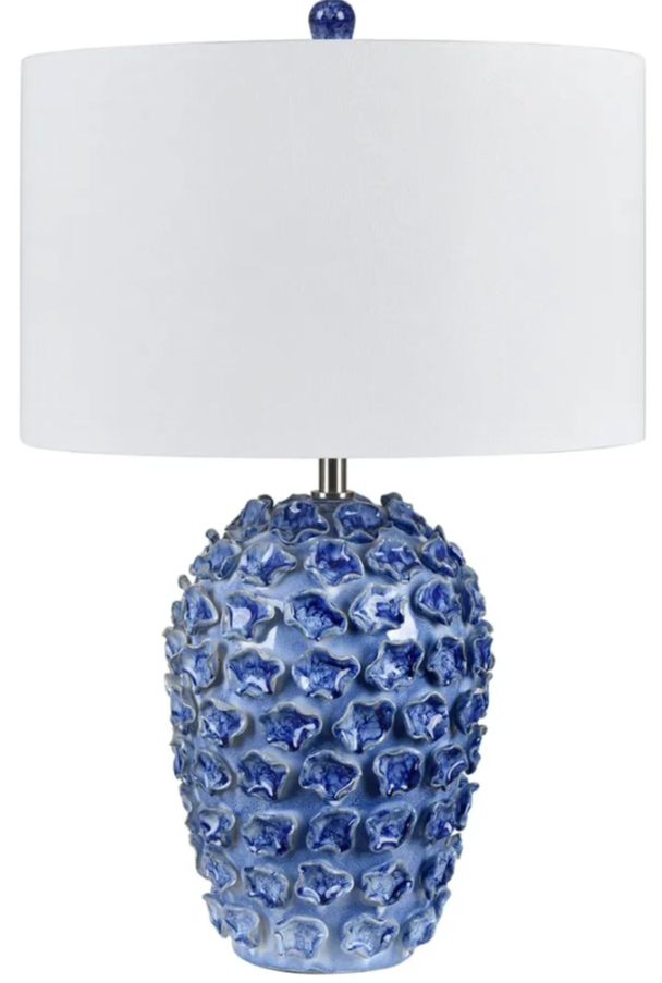 Vibrant and textural, this coastal ceramic table lamp features a sculpted body covered in layered petal-like forms, finished in a rich, high-gloss ocean blue glaze. Topped with a white linen hardback drum shade and a coordinating ceramic finial, it adds color and character to any space.Read More