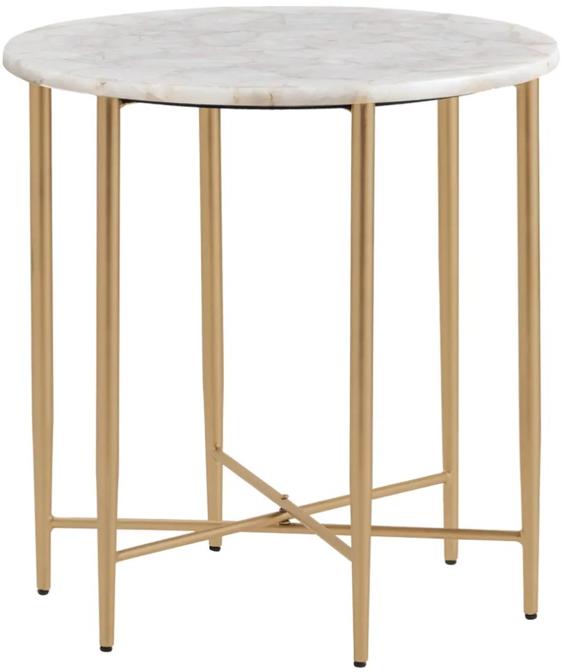 The Crestview Collection Katherine Round Accent Table features a clean, elegant look that will brighten up your home. This round, transitional accent table has six legs connected by an asterisk design in the middle. The gold finish of the metal legs complement the white marble table top that will beautifully support your favorite lamp or plant.Read More