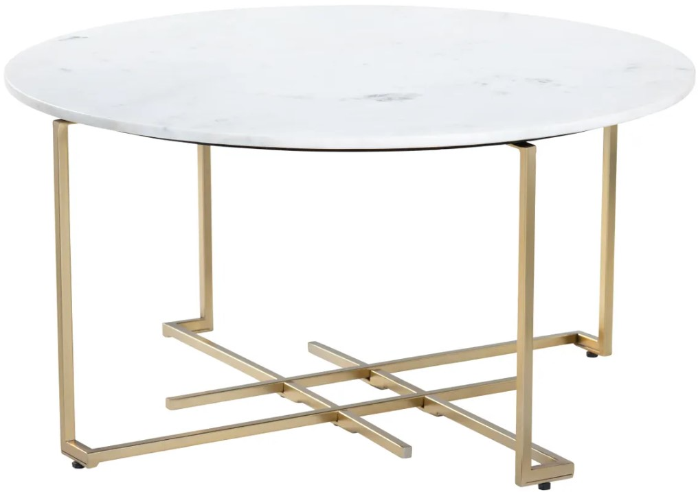 The Crestview Collection Pembroke Round Cocktail Table will make a beautiful centerpiece in your living room. A white table top is supported by a gold iron frame. The frame has four legs that cross along the floor to create a square with extended pieces.Read More