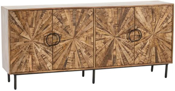 The Crestview Collection Roswell Sideboard has four doors that feature a pinwheel design that is sure to catch anyone's eye. Made of mango wood, this rustic sideboard has a medium-brown finish complemented by black metal legs. It has two holes for cable management.Read More