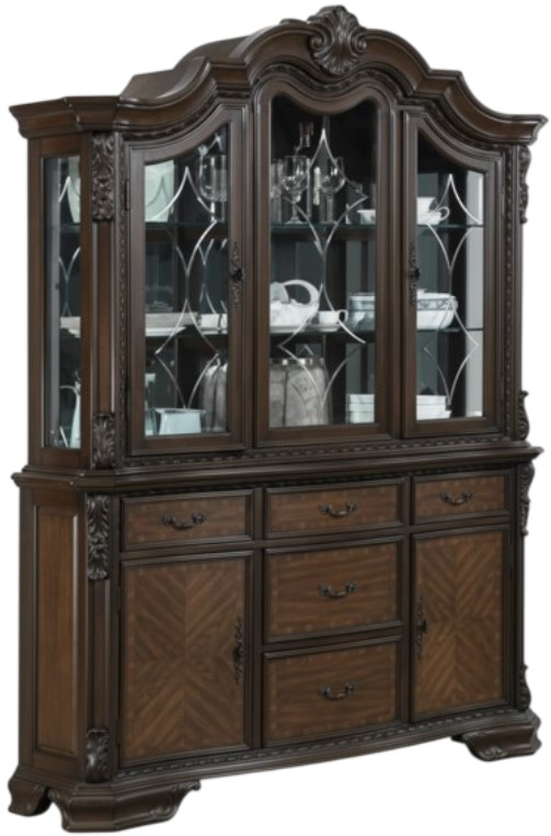 Experience refined elegance with this richly finished china cabinet, featuring ornate carvings, beveled glass doors, and warm interior lighting. Its spacious shelves and felt-lined drawers beautifully showcase and protect your finest pieces, bringing timeless sophistication and functional luxury to your dining space.Read More