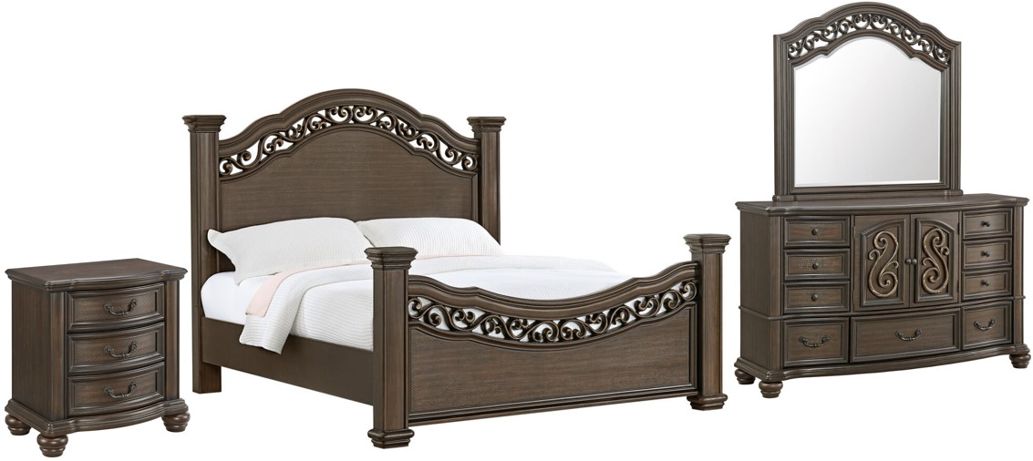 Includes bed, dresser, mirror and nightstand