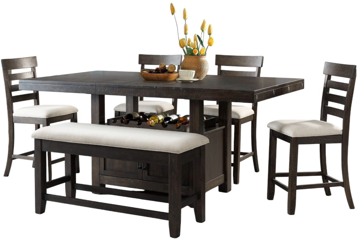 Set includes dining table with wine rack, 4 side chairs and dining bench.