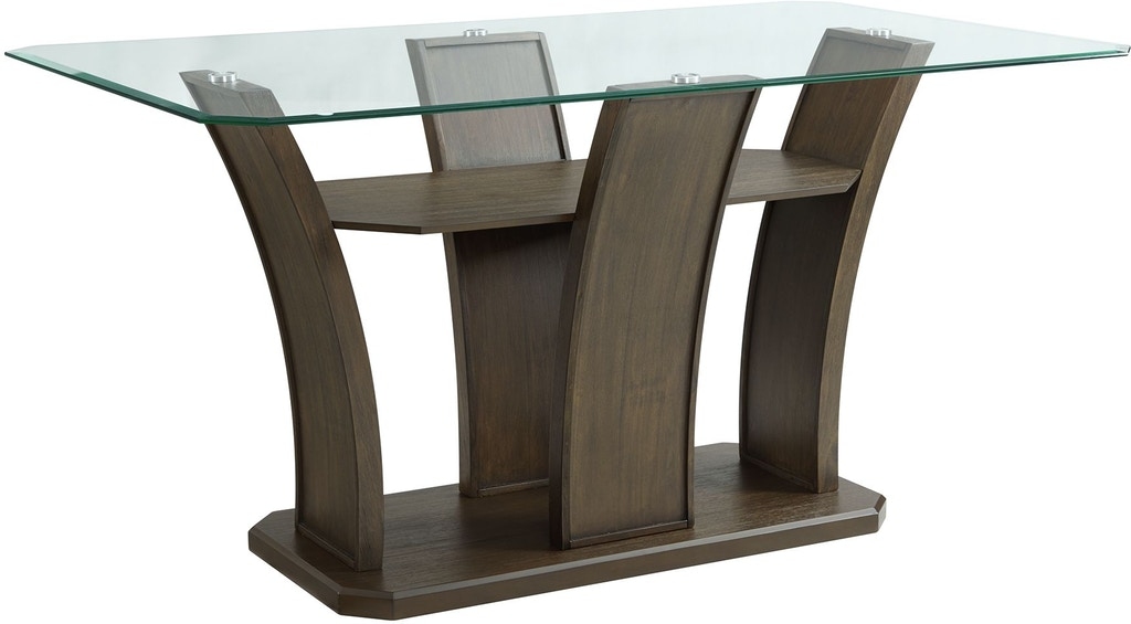 The Dapper dining set features a counter height table with a glass top and wooden base. The wooden base is finished in a weathered brown.Read More