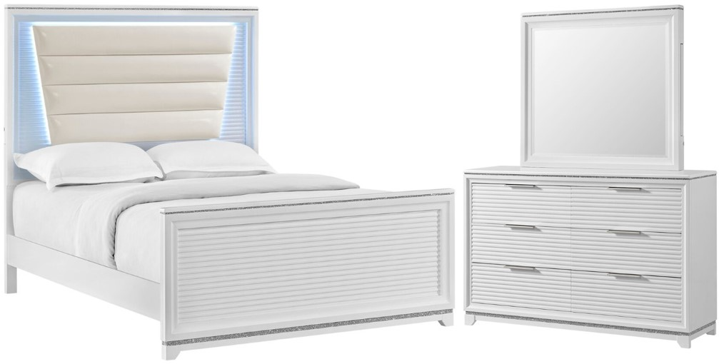 This Denmark Bedroom Set features a sleek, modern design with a queen-size upholstered bed with LED lighting, a six-drawer dresser, and a matching mirror. Finished in crisp white with textured details, this stylish set offers elegance, functionality, and ample storage for any bedroom.Read More