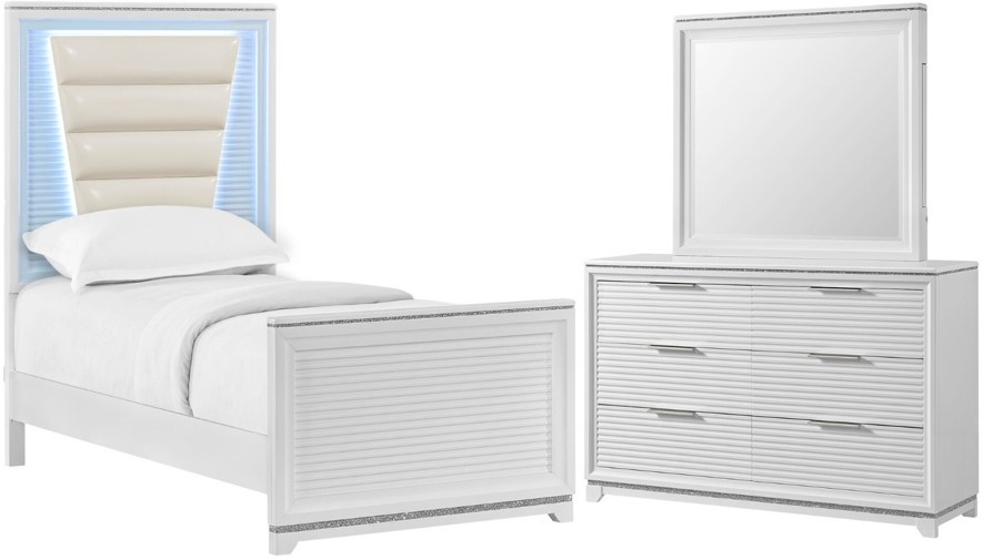This Denmark Bedroom Set features a sleek, modern design with a twin-size upholstered bed with LED lighting, a six-drawer dresser, and a matching mirror. Finished in crisp white with textured details, this stylish set offers elegance, functionality, and ample storage for any bedroom.Read More