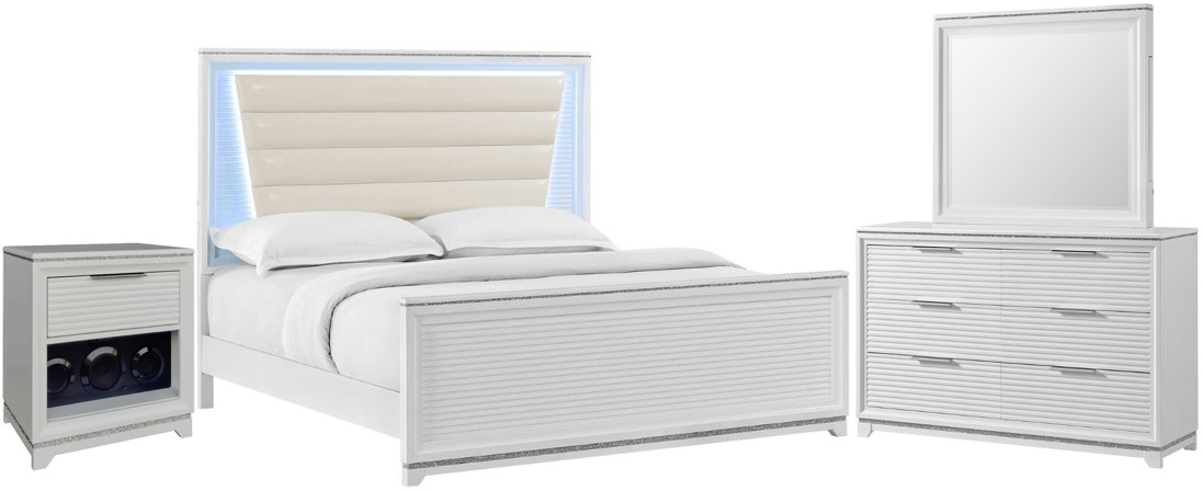 This Denmark Bedroom Set features a sleek, modern design with a king-size upholstered bed with LED lighting, a six-drawer dresser, a matching mirror and a nightstand. Finished in crisp white with textured details, this stylish set offers elegance, functionality, and ample storage for any bedroom.Read More