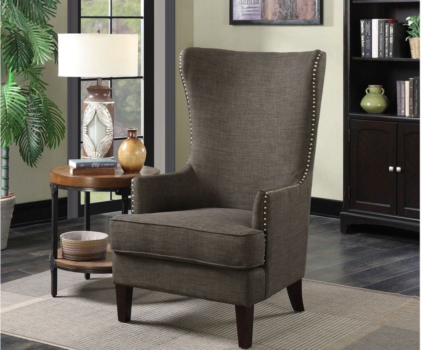 The delightful Kori accent chair boasts a charming array of vibrant color options as well as a refined design. Resting on espresso legs, the Kori's crisp lines, elegant long back and chic studded trim make this a one-of-a-kind upholstered sensation in any home.
