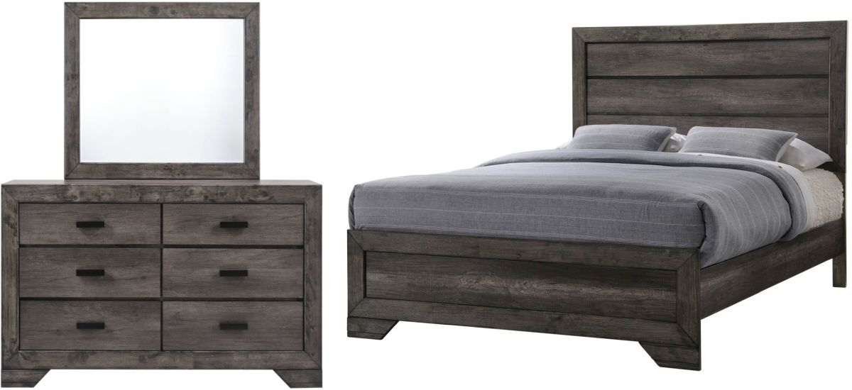 Elements International Nathan Gray Oak King Bed with Dresser and Mirror. Dressed in a distressed gray oak finish, the handsome Nathan bedroom collection adds warmth and style to any room. Featuring clean lines and modern black finished hardware, this transitional set is sure to impress. Enjoy its stylish wood panel headboard, accented by woodgrain and distressing for a warm look. Matching case pieces with spacious storage drawers complete the look of this modern farmhouse inspired collection.