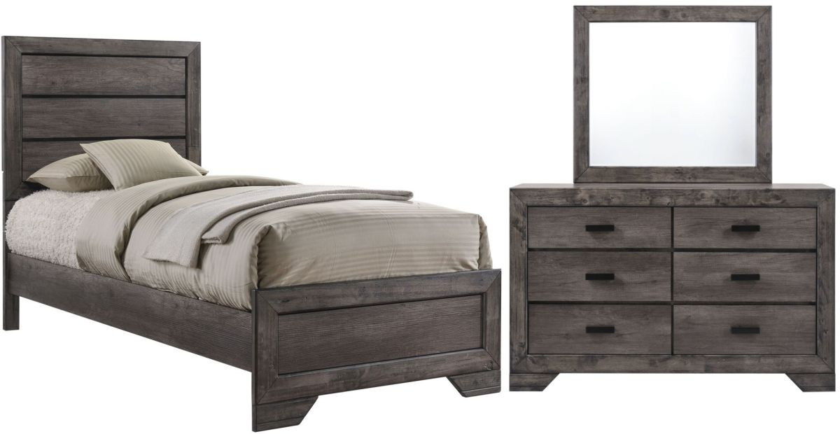 Elements International Nathan Gray Oak Twin Bed with Dresser and Mirror. Dressed in a distressed gray oak finish, the handsome Nathan bedroom collection adds warmth and style to any room. Featuring clean lines and modern black finished hardware, this transitional set is sure to impress. Enjoy its stylish wood panel headboard, accented by woodgrain and distressing for a warm look. Matching case pieces with spacious storage drawers complete the look of this modern farmhouse inspired collection.