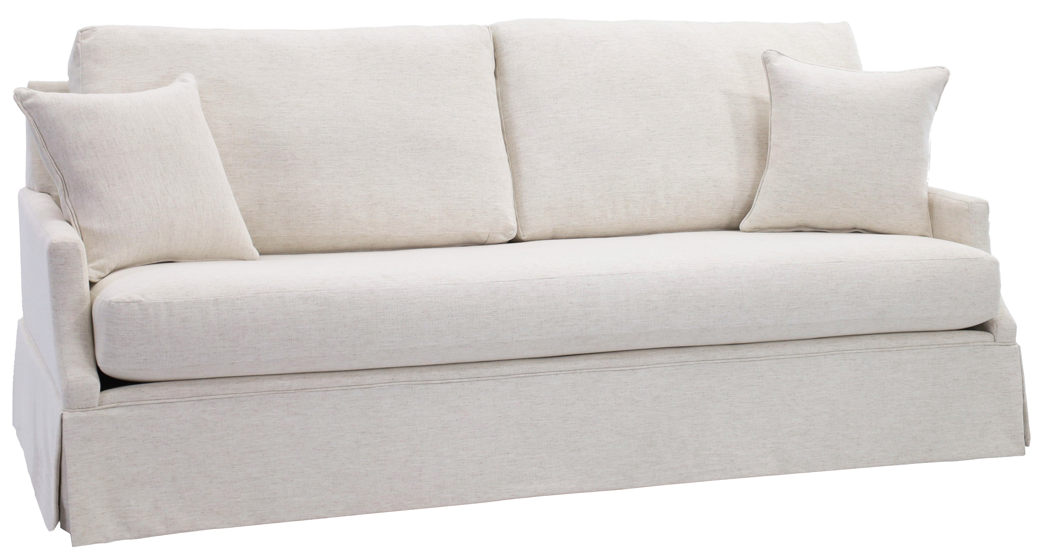 This skirted sofa features 2 encased back pillows over a bench Conovo-Lux seat cushion. It is in the Nomad Snow fabric which is a Crypton performance fabric to help keep it clean!Read More