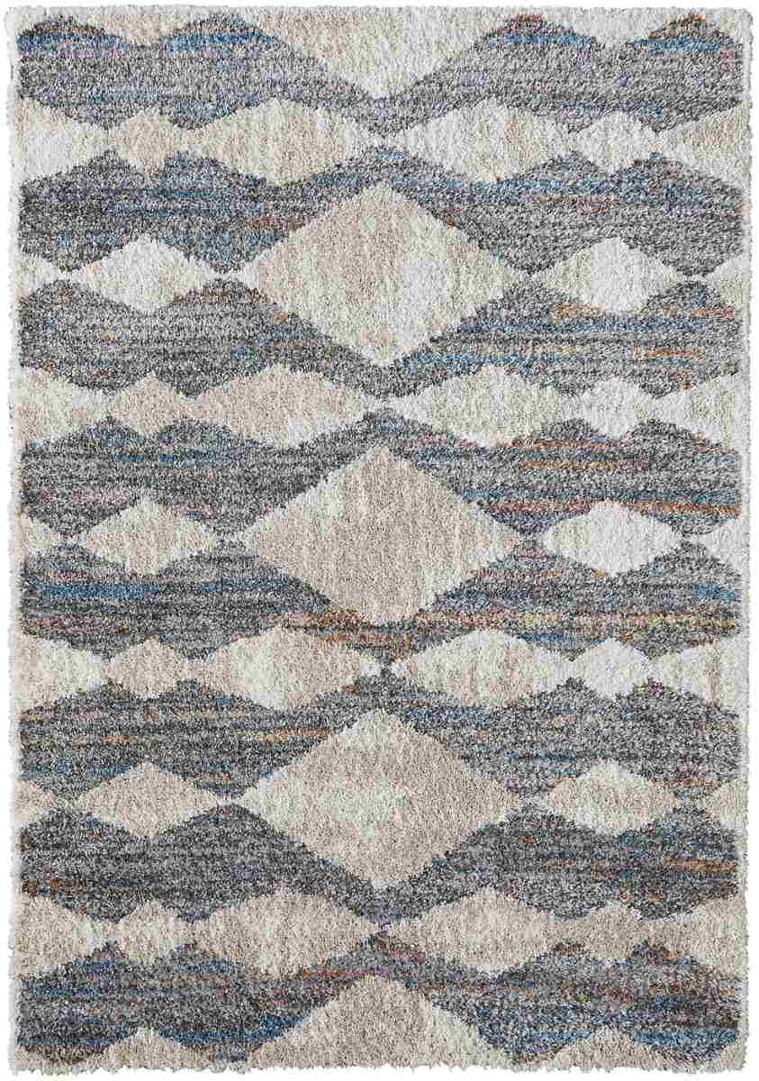 Inspiring motifs of neutrality rest atop cool hues of blue and gray, enveloping pops of orange and pink. Each elegant shag pile is made with a slight high-low between its design and base creating a plush hand that begs to be felt. The Mynka Collection is machine-made and constructed of 100% polyester in Turkey.