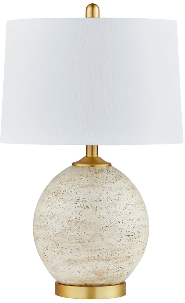 Forty West Estell White Table Lamp features drum shape shade, white color, and white base.Read More