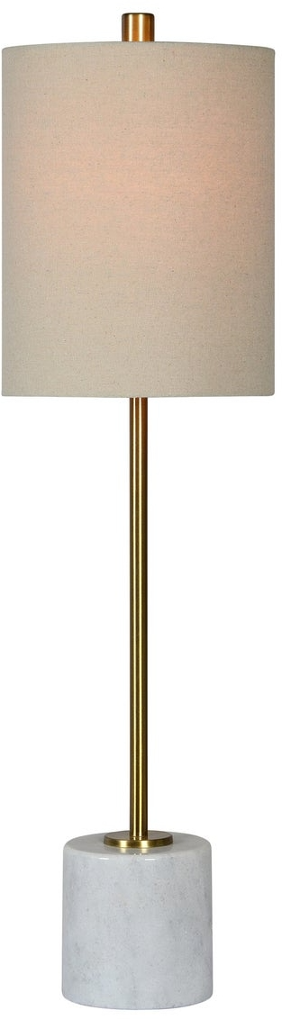 Forty West Zola Buffet Lamp features a gold brass finish over metal slim bar atop a a marble constructed base paired with a hardback drum shade.Read More
