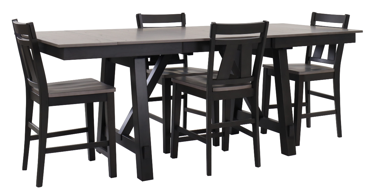Upgrade your dining room with this beautifully finished gathering table set with 4 counter chairs. This counter height dining table features a two tone finish and a leaves on each end to extend the table when needed.