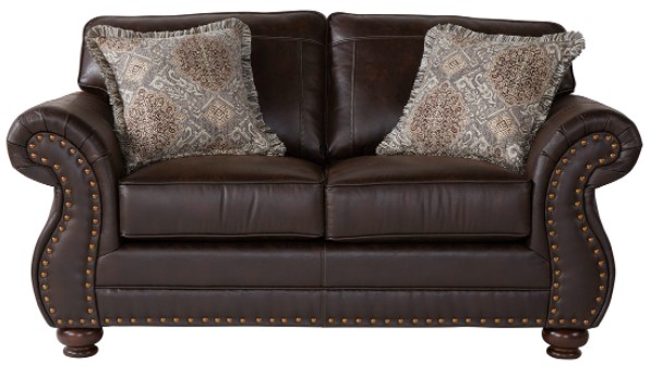 This loveseat from the 17400 collection has a traditional lodge style in two leather-look fabrics with antique gold nailheads, welt, and topstitched back cushions. Make a bold statement by incorporating this stunning loveseat into your home.Read More