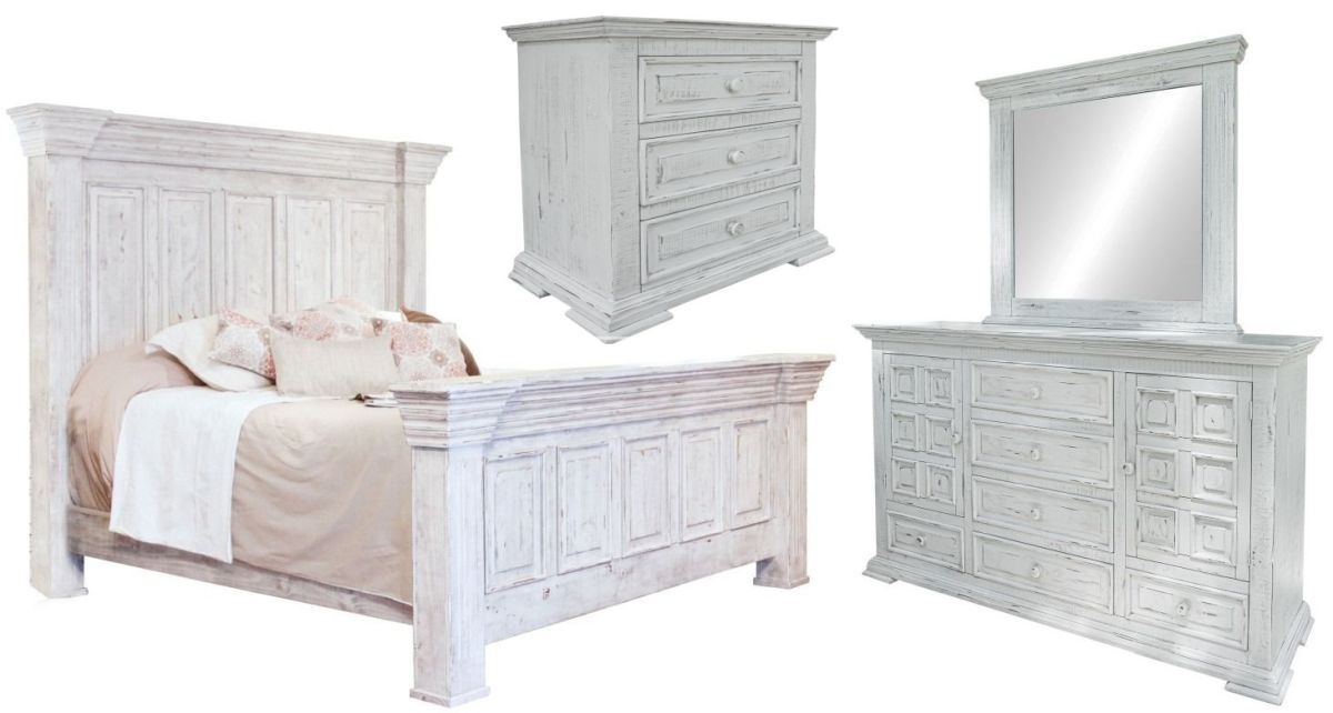 Multi step nitrocellulose based lacquer finish in a beautiful distressed vintage white finish. Mortise and tenon case construction on all pieces. Set includes Bed, Mirror, Dresser and NightstandRead More
