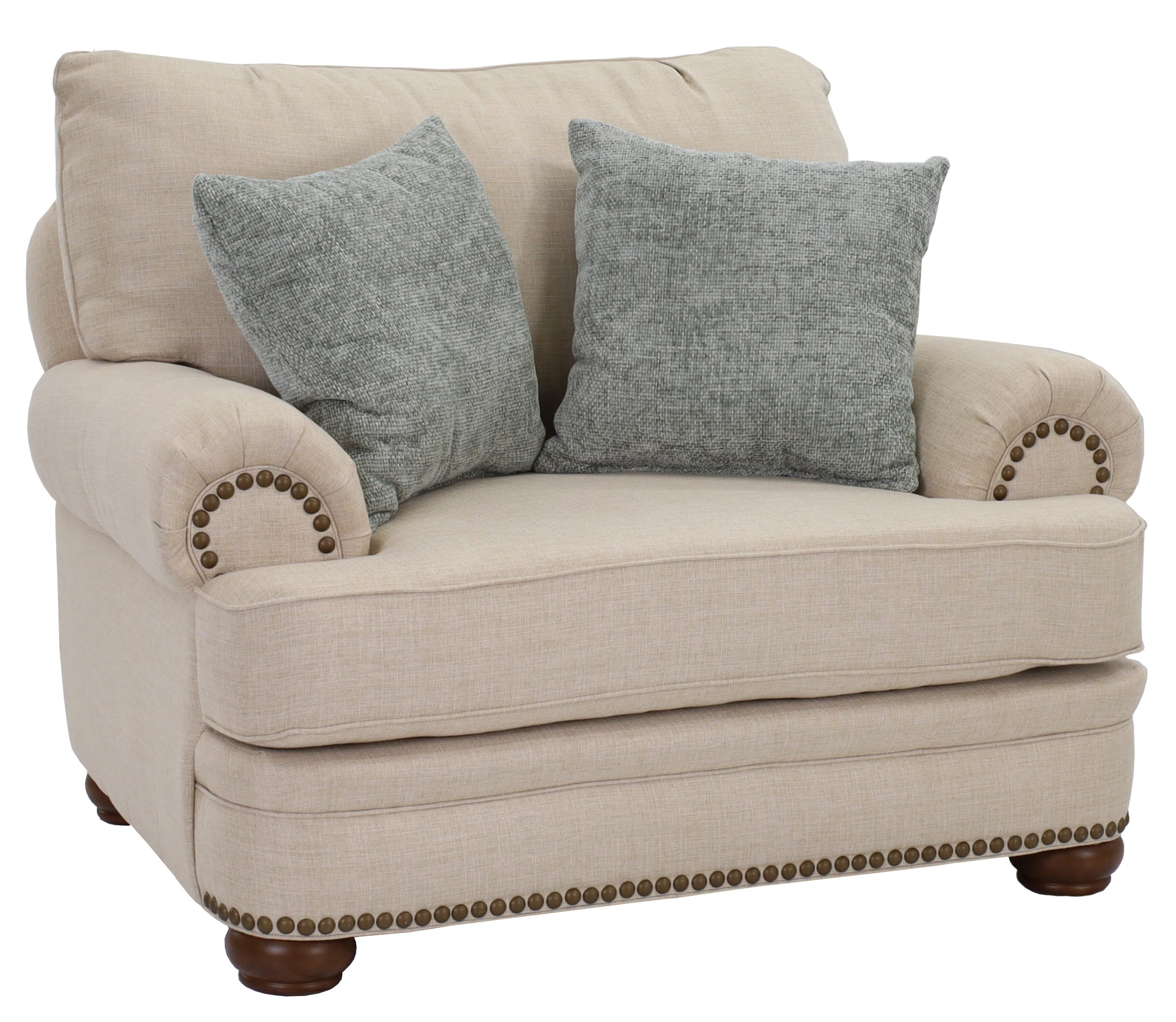 This chair and a half is featured in the Flash Oat cover and comes with 2 accent toss pillows. Add the sofa, loveseat, ottoman, and accent chair to complete your living area.Read More