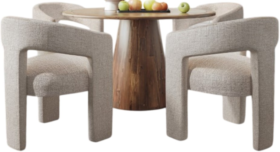 Elevate your dining space with this dining set, a perfect blend of organic warmth and contemporary flair. Featuring a round solid wood table with a rich brown finish, this set is paired with four ultra-modern natural upholstered chairs, designed for both comfort and statement-making style.Read More