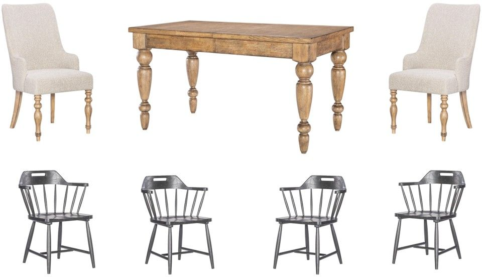 *Table, four spindle back arm chair and two upholstered arm chair only, any other products that may be displayed are sold separately. Images may not represent the actual size and color in images may differ in person. See store for the actual color or finish.