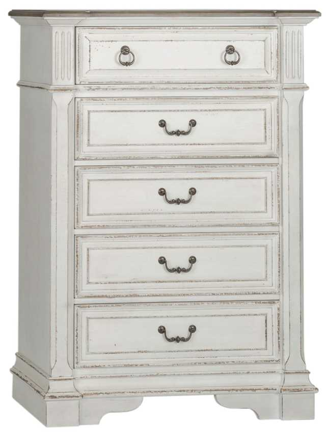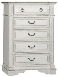 This Abbey Park drawer chest is the perfect way to accent your room with an effortless blend of European Traditional design. Weathered brown whitewash top and antique white finish, combined with heavy chipping, creates a truly unique look. The post design with fluted top accents and chamfered edges completes this traditional piece.Read More