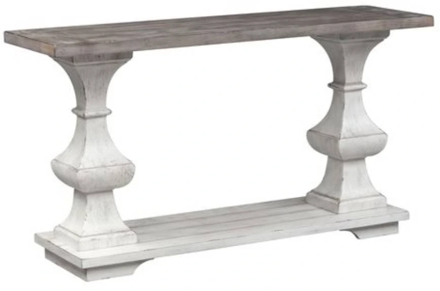 Enhance your space with the Spanish style Sedona sofa table. Crafted of rubberwood solids and white oak veneers, this piece features a heavy distressed white finish and gravel top, a planked top with peg accents, appealing bead molding, a planked bottom shelf for additional storage, anchored by Spanish style square turned legs.Read More