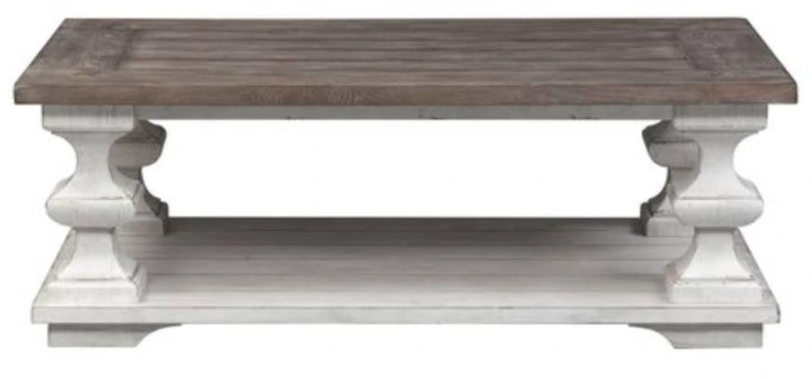 Elevate your space with the Spanish style Sedona cocktail table. Crafted of rubberwood solids and white oak veneers, this piece features a heavy distressed white finish and gravel top, appealing planked top with square peg accents, a planked bottom shelf for additional storage, casters for easy mobility, and is anchored by Spanish style square turned legs.Read More