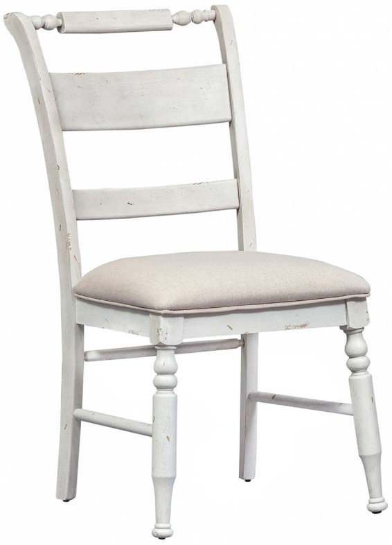 Sit in comfort and style with the Whitney slat back side chair. Crafted of rubberwood solids, this piece features English country charm, linen upholstery, turned cap rail, nylon chair glides to protect your flooring, and is anchored by beautifully turned front legs.Read More