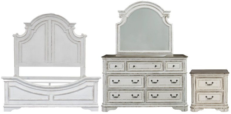 A refined yet relaxed feel describes the Magnolia Manor queen panel bed, dresser, mirror, and nightstand. Crafted of poplar solids with white oak and birch veneers, this kit features an antique white finish with heavy artistic chipping.Read More