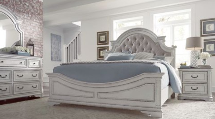 Opt for an elegant display. A refined yet relaxed feel describes the Magnolia Manor king upholstered bed, dresser, mirror, and nightstand. Crafted of poplar solids with white oak and birch veneers, this kit features an antique white finish with heavy artistic chipping and weathered brown with whitewash tops.Read More