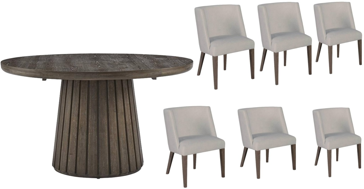 Offering a fresh take on transitional dining, the Kavanaugh collection is sure to turn heads. Its easygoing look is crafted from a Weathered Kona Brown finish and sophisticated neutral fabric upholstery that will complement any interior space.Read More