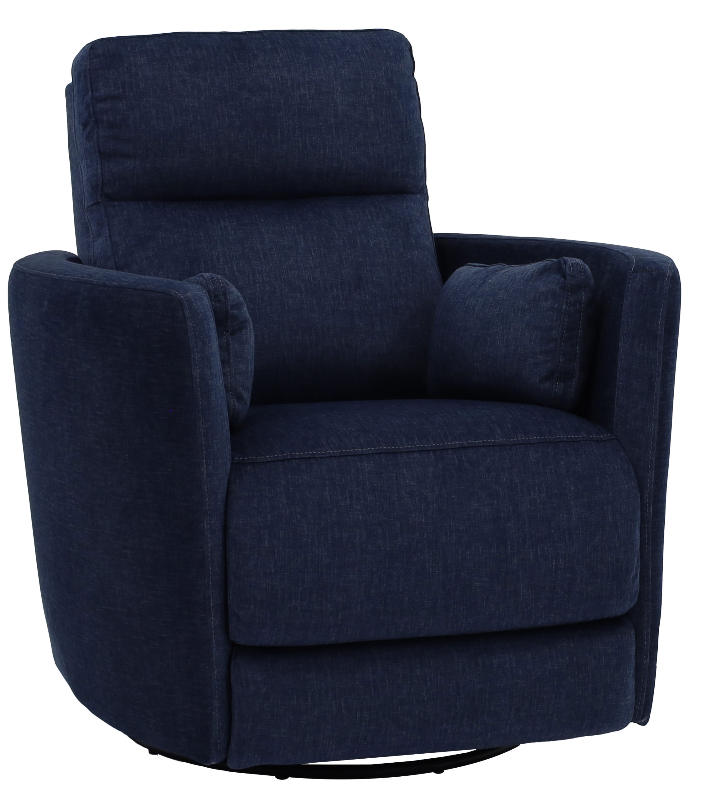 This barrel swivel recliner by Man Wah features sleek curved track arms and two arm pillows. It is in an indigo fabric.