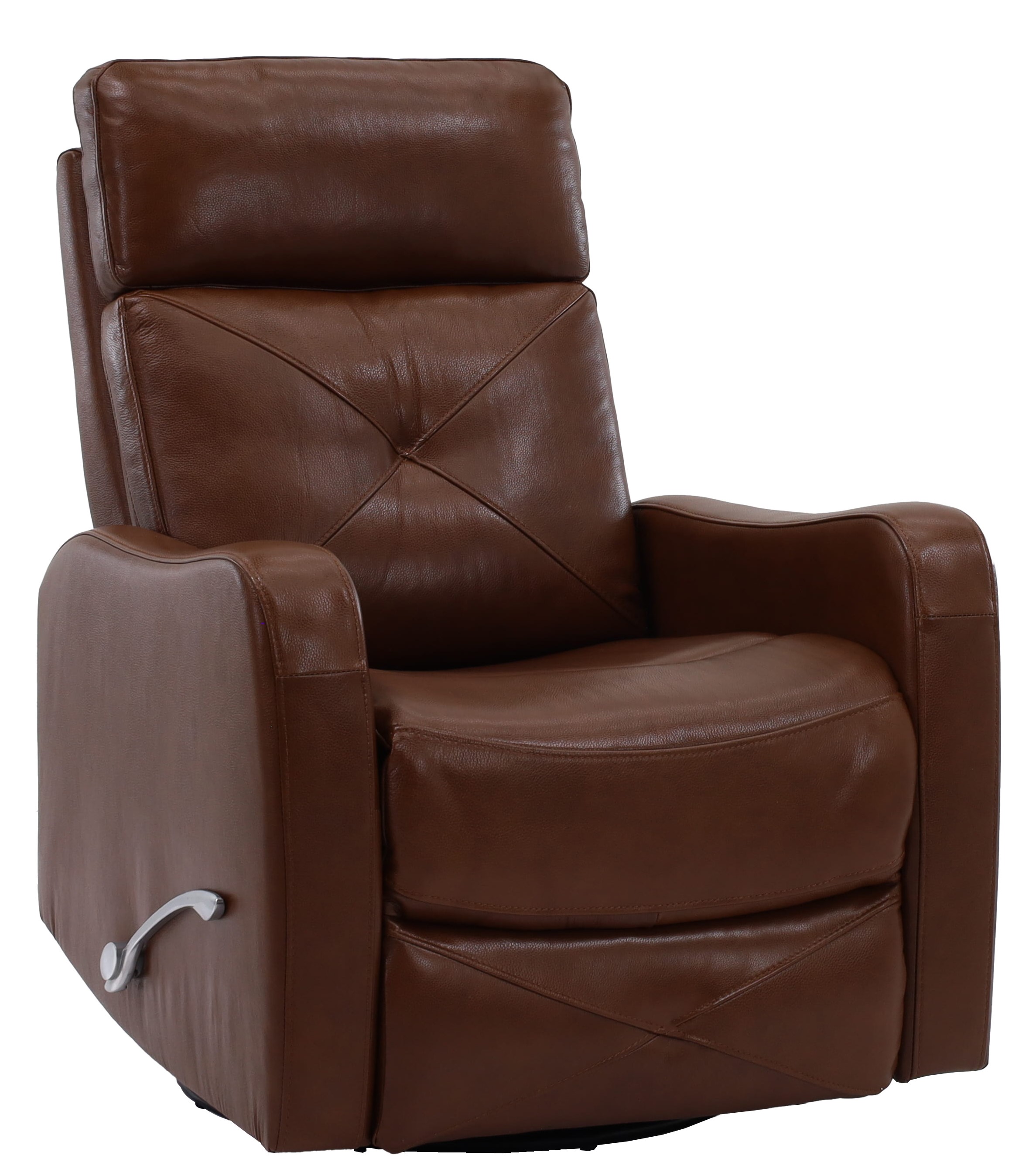 This swivel glider recliner by Man Wah features sleek curved track arms and a handle on the side for the reclining positions. It is in a caramel color leather.