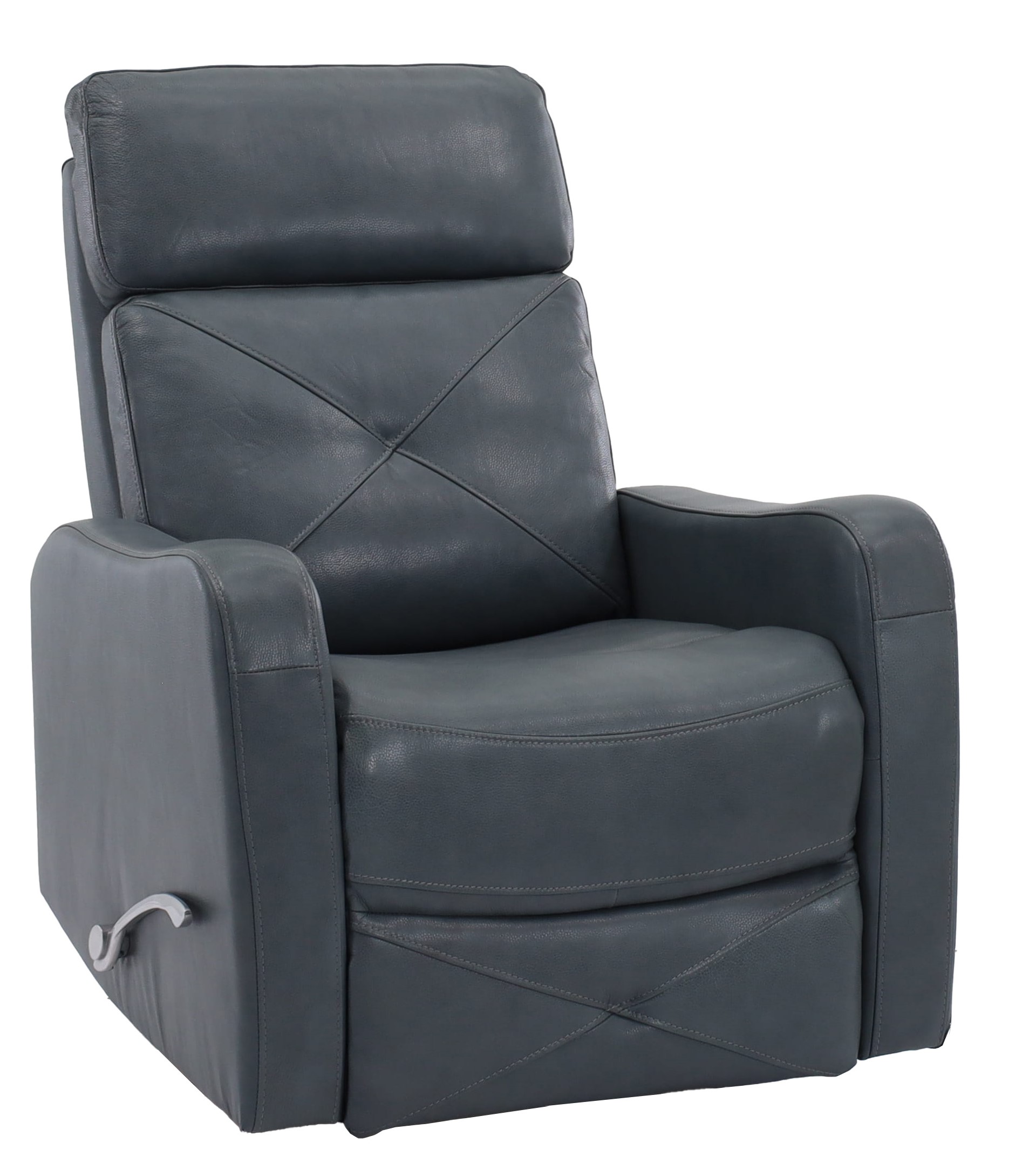 This swivel glider recliner by Man Wah features sleek curved track arms and a handle on the side for the reclining positions. It is in a caribbean color leather.
