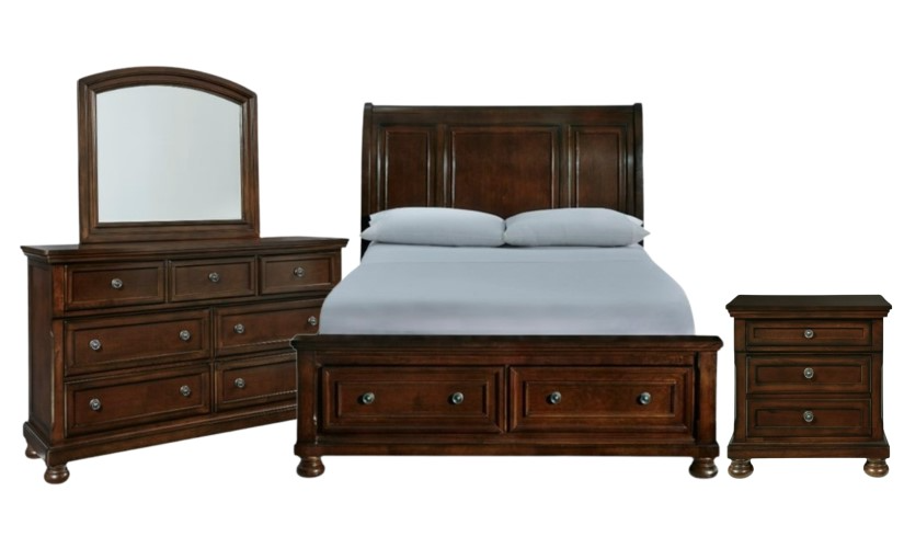 Set includes queen storage panel bed, nightstand, dresser and mirror