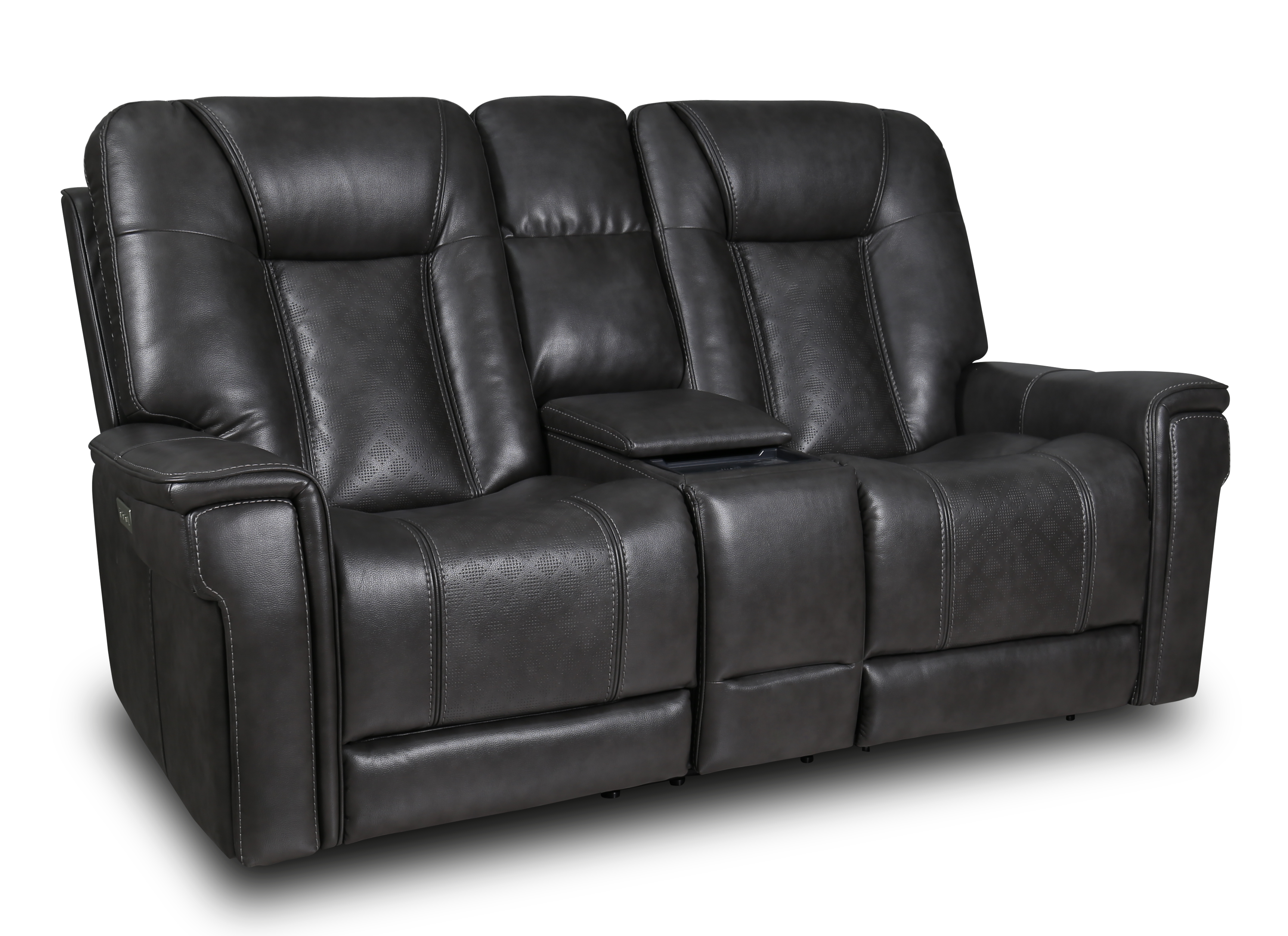 This power reclining console loveseat from Moto Motion offers many wanted features and benefits. It has power headrest and lumbar, lay flat recline with extended footrest, and a USB charging port.