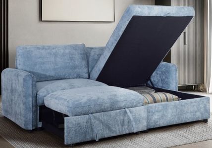 The Finn storage chaise sectional with pop-up sleeper loveseat in blue blends modern design with multi functional convenience. The loveseat transforms into a comfortable sleeper for guests, while the chaise features hidden storage for blankets and essentials. Upholstered in 100% polyester fabric, it offers durability, stain resistance, and easy care.Read More