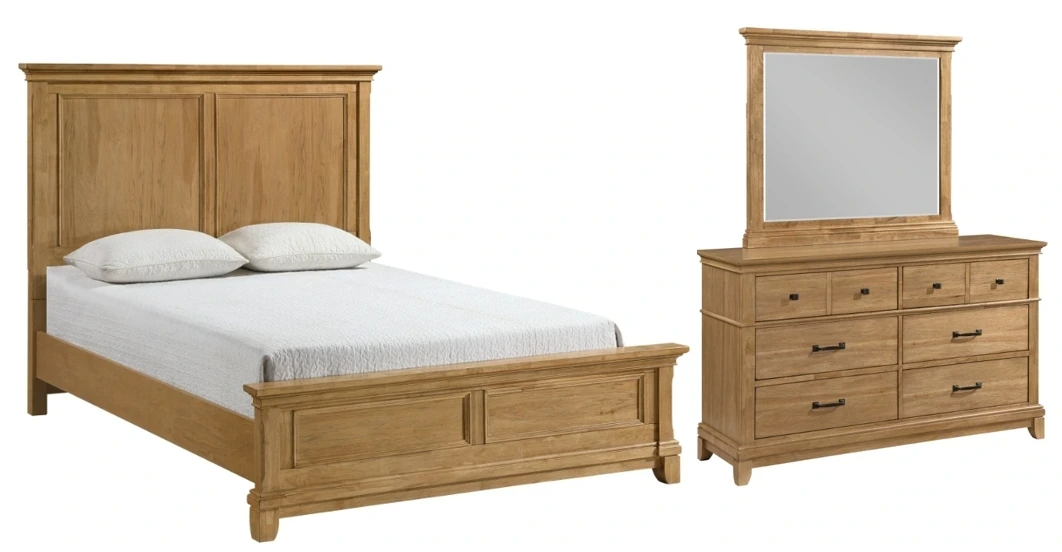 The Sunstone Bedroom Collection offers timeless elegance and robust construction, making it the perfect choice for those seeking both style and durability. The hand-applied stain enhances the natural grain patterns, creating a warm and inviting atmosphere. Elegant features such as raised bases, full return moldings, and contrasting hardware add a sophisticated appeal.Read More