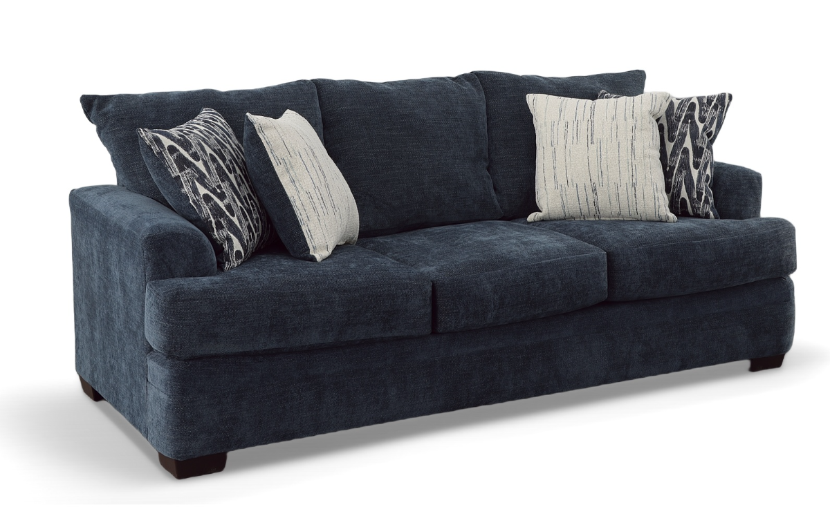 This sofa is a simple piece that is ideal for casual styled living rooms. It works well to create an atmosphere that is homey and relaxed yet also decorative. The flared arms and exposed wood legs give it an updated look while the throw pillows add accent to the piece.