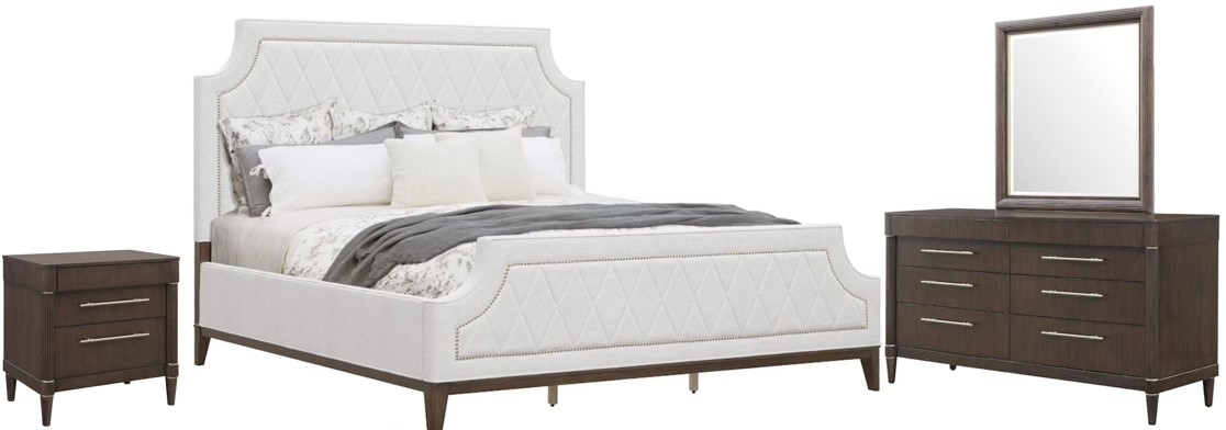 This 4-piece bedroom set combines neo-classic elegance with modern refinement, featuring a queen upholstered panel bed, dresser, mirror, and nightstand. A rich Piano Brown finish on eucalyptus veneers and rubberwood solids pairs beautifully with white fabric panels, while nail head trim and metallic accents add a luxurious touch for timeless sophistication.Read More